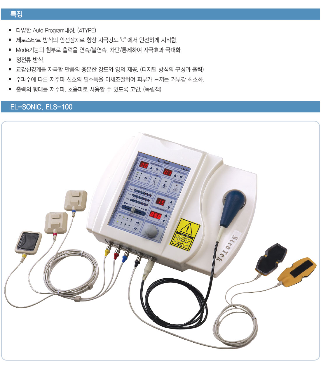 EL-SONIC, ELS-100은 초음파자극과 전기 자극을 손쉽게 환자에게 적용할 수 있는 의료용 조합자극기입니다.